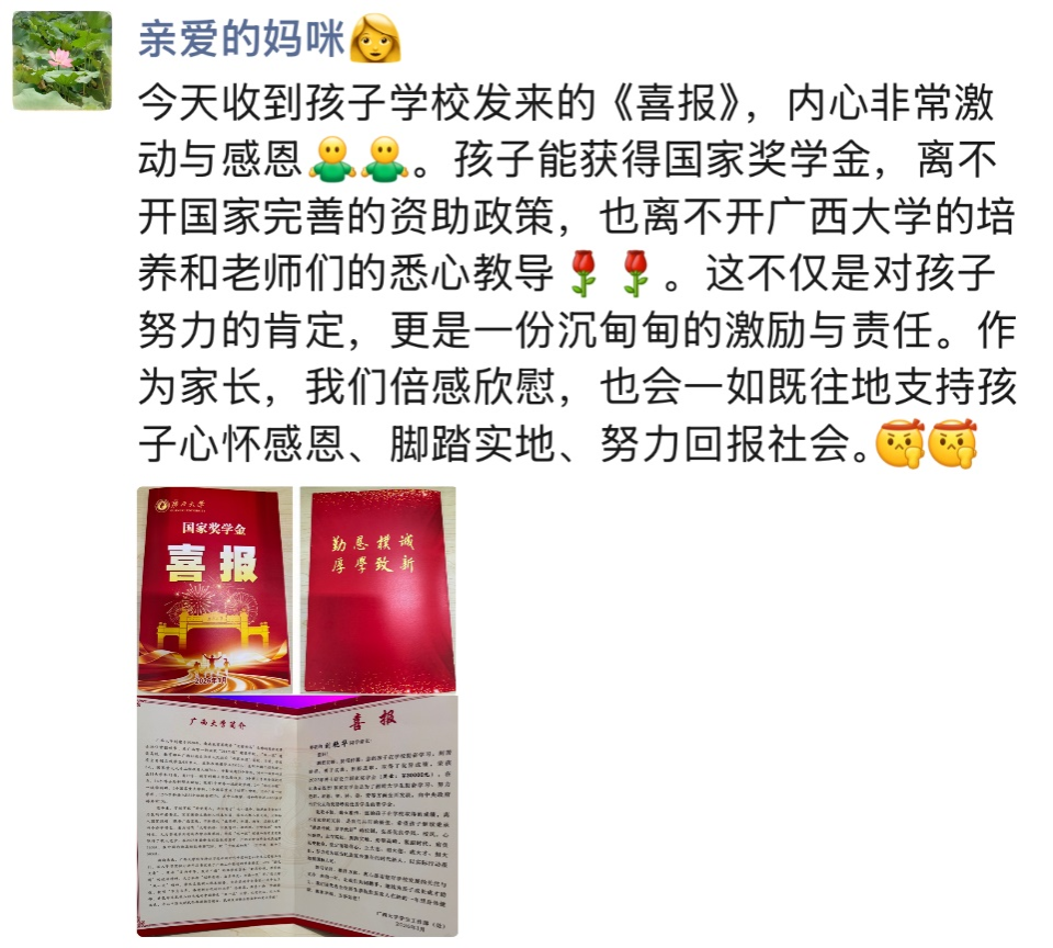 “收到了孩子学校发来的喜报,感谢学校的培养!”寒假前夕,广西大学向荣获2024-2025学年度国家奖学金、国家励志奖学金及自治区人民政府奖学金的1447名学生家中寄送喜报,以此作为一份特殊的新年礼物。学校以资助育人为出发点,将奖学金发放过程转化为感恩教育与政策宣传的课堂,做到在激发获奖学生内驱力的同时,实现家校协同育人的“双向奔赴”,该做法获得了家长与学生的一致认可。