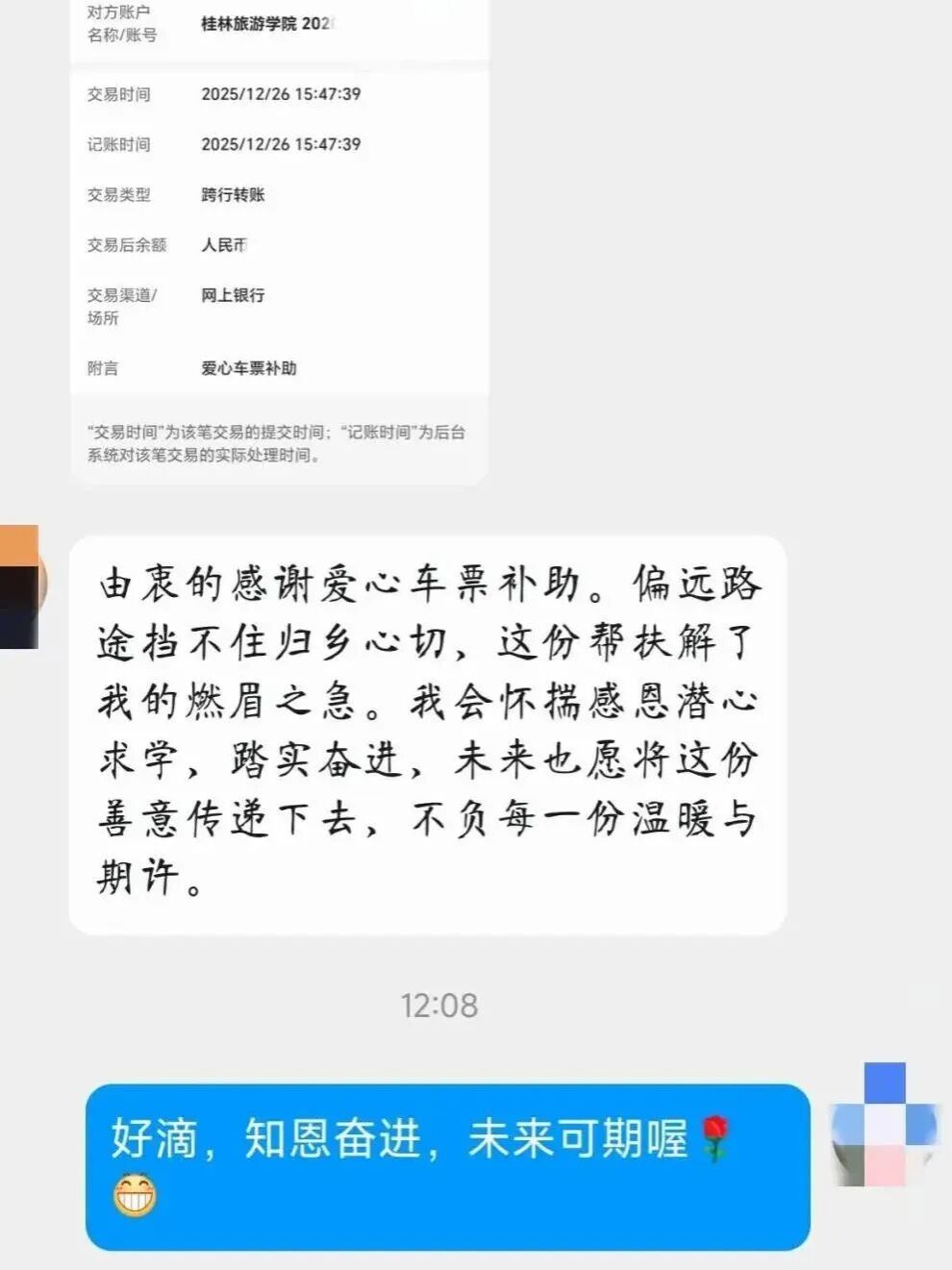 不用申请、不用公示,补贴直接到账。桂林旅游学院为缓解学生返乡的经济压力,创新设立“爱心车票”专项补贴项目,通过综合学生家庭经济状况、返乡路程及车票花费等情况,精准确定补助名单,以“隐形资助”方式将关怀直接送达学生账户。该项目自启动以来,共发放车票补贴7.6万元,惠及受助学子542名,有效缓解其返乡的经济压力,以精准的隐形帮扶,为困难学子铺就了温暖的返乡之路。